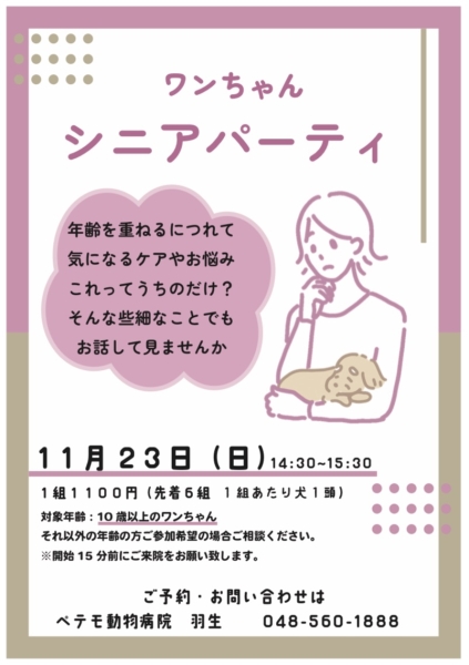 10:30~12:30 愛犬の元気の源!健康ごはん講座13:30~15:30 愛犬のシニアライフをもっと幸せに!シニアケアの極意詳細・お申し込みはあにまるケアハウスさまへ TEL:0120-57-8102 HPのお問い合わせフォーム、各種SNSのDMからもどうぞ